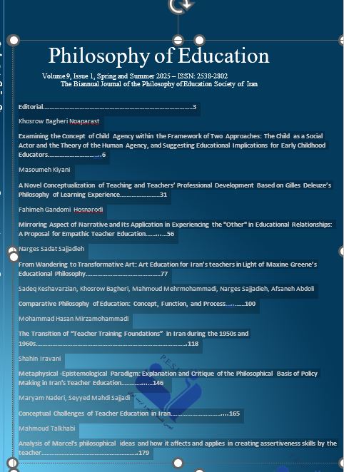List of Articles Open Access Article Abstract Page Full-Text 1 - Examining the Concept of Child Agency Within Two Frameworks: "Child as a Social Actor" and the "Theory of the Agentic Human" and Its Educational Implications for Early Childhood Educators Masume Kiyani Open Access Article Abstract Page Full-Text 2 - A new conceptualization of the nature of teaching and the professional development of teachers based on Gilles Deleuze's ideas about the nature of learning fahimeh gandomi Open Access Article Abstract Page Full-Text 3 - The Reflective Mirror: Narrative and Its Application in the Experience of the "Other" in Educational Relationships: A Framework for Empathetic Teacher Training Narges Sajadieh Open Access Article Abstract Page Full-Text 4 - From Wandering Art to Social and Transformative Art: A Perspective on Teacher Art Education in Light of Maxine Greene's Educational Philosophy sadeq keshavarzian khosrow Bagheri MAHMOUD MEHRMOHAMMADI narges sajadeh افسانه عبدلی Open Access Article Abstract Page Full-Text 5 - Philosophy of Comparative Education; concept, function, process mohammad mirzamohammadi Open Access Article Abstract Page Full-Text 6 - The Transition of “Teacher Training Foundations” in Iran during the 1950s and 1960s shahin iravani Open Access Article Abstract Page Full-Text 7 - Metaphysical -Epistemological Paradigm: The philosophical Basis of Plicy Making in Iran's Teacher Education (Explanation and Criticism) DR.SAYED MAHDI SAJADI مریم نادری Open Access Article Abstract Page Full-Text 8 - Conceptual Challenges of Teacher Education in Iran Mahmoud Talkhabi Open Access Article Abstract Page Full-Text 9 - Analysis of Marcel's philosophical ideas and how it affects and applies it in creating Assertiveness skills by the teacher فهیمه اکبرزاده Open Access Article Abstract Page Full-Text 10 - The application of mathematics education in the formation of philosophical disposition مجتبی پورکریمی هاوشکی Rasoul eskandari Open Access Article Abstract Page Full-Text 11 - The Mission of the Educational Philosopher and the Challenge of Artificial Intelligence: A Glimpse into the Iranian Context ahmad baniasadi Open Access Article Abstract Page Full-Text 12 - Explaining the Parent School Concept Based on Emergentism Approach and Its Role in Advancing Early Childhood Education Zahra َAsaadi Masoud Safaie Moqaddam seyyed jalal hashemi Parvaneh Valavi Open Access Article Abstract Page Full-Text 13 - The Ethics of Artificial Intelligence in Education Ramazan Barkhordari